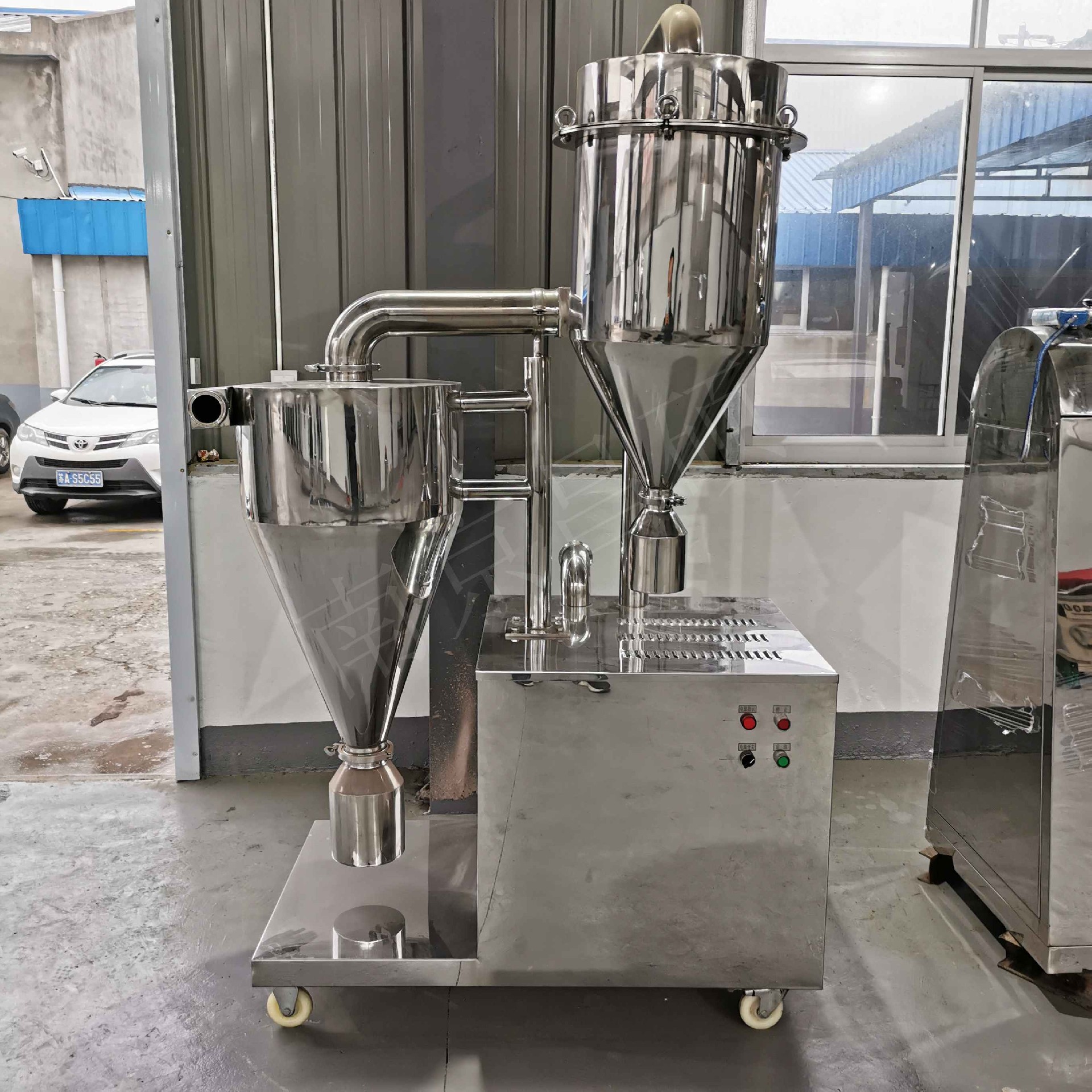 我公司生產的真空加料機是在廣泛吸收國外同類產品的基礎上開發研制的新產品,目前它是國內較為先進、理想、完善的粉狀料、粒狀料、粉粒料混合料的真空輸送設備。真空加料機能自動地將各種物料輸送到包裝機、注塑機、粉碎機等設備的料斗中,也能直接把混合的物料輸送到混合機(如V型混合機、二維混合機、三維混合機等)中,減輕了工人勞動強度,解決了加料時粉塵外溢等問題,是制藥廠、食品廠通過GMP認證、促進清潔、文明生產的首選設備。