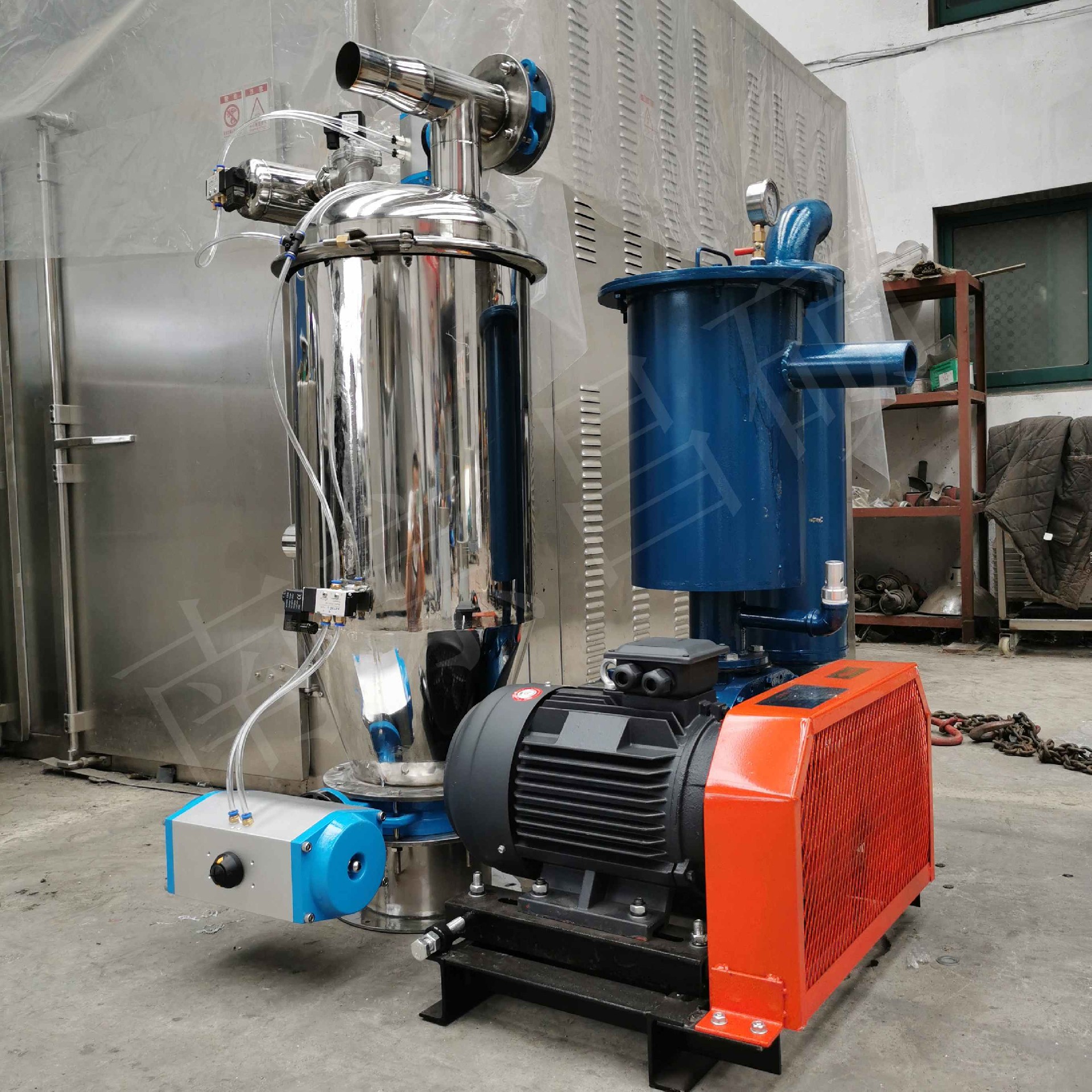 真空加料機由真空泵(無油、無水)、不銹鋼吸料咀、輸送軟管、PE過濾器(或316L不銹鋼過濾器)、壓縮空氣反吹裝置、氣動放料門裝置、真空料斗和料位自動控制裝置等組成,整套系統設計合理、制造精美。