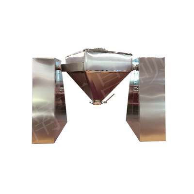 將物料裝入方錐形密閉混合桶內,料斗對稱的軸線與回轉軸軸線成一夾角,不同組分物料在密閉的料斗中進行三維空間運動,產生強烈翻轉和擴散收縮作用,達到較佳的混合效果。