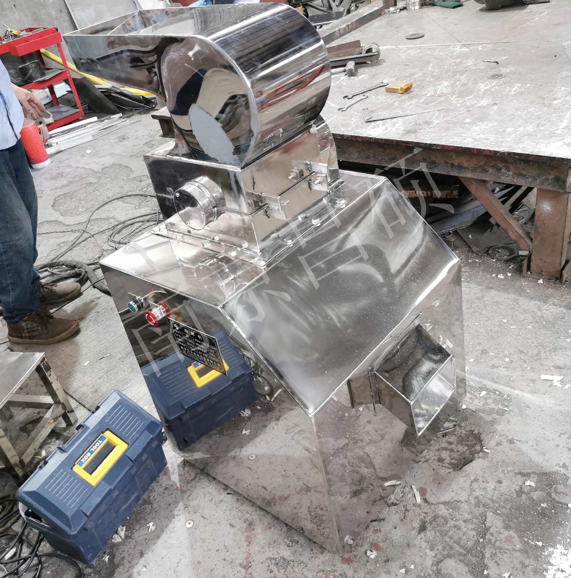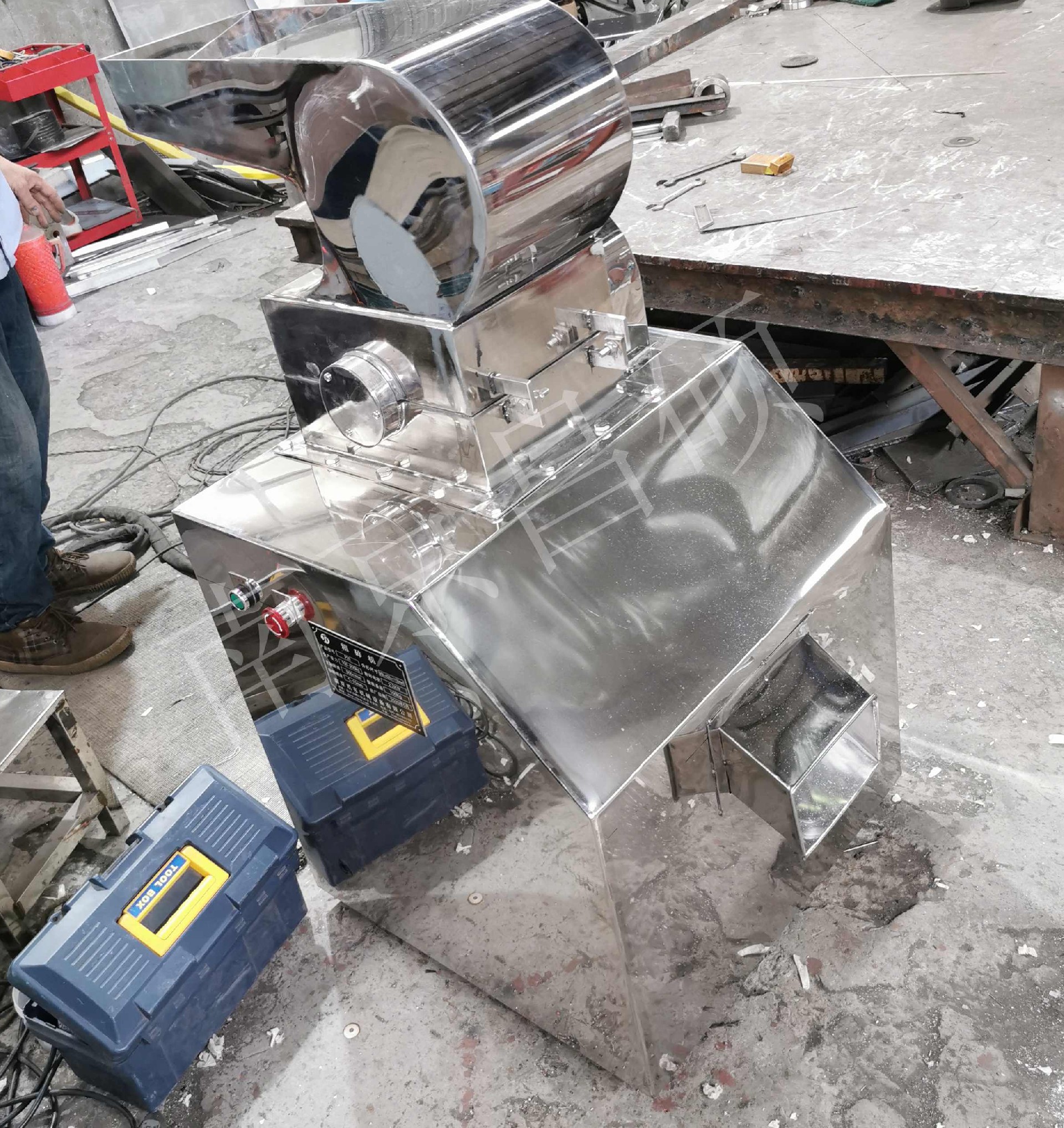 本機為立式粉碎結構,物料由進料斗送進粉碎室,利用旋轉刀旋轉沖擊,固定刀和活動刀同時剪切而獲得粉碎,經旋轉離心力的作用,物料自動流向出口處。另外,該機按“GMP”標準設計,整機采用不銹鋼材料制造,使藥品、食品等能符合國家衛生要求,整機采用不銹鋼材料制造,結構簡單,清洗方便、噪音低、目前是粗粉碎中最理想的設備。